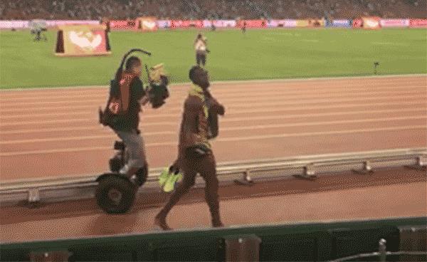 在北京田徑世錦賽上,男子200米決賽奪冠的牙買加飛人尤塞安·博爾特,在繞場致謝時被跟拍攝像師"追尾"。
