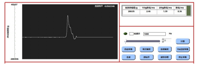 主要反映頭盔在發生撞擊時吸收沖擊能量,減輕對頭部傷害的能力。在檢測試驗時需要將固定在頭模(模擬人體頭部)上的頭盔從規定高度墜落,并考核1個現象和2個技術參數,以A類頭盔為例,試驗后頭盔殼體不得出現裂口現象,碰撞后傳遞到頭模的峰值加速度(表征沖擊力大小)不得超過300g,加速度超過150g的作用時間(表征傷害性沖擊的持續時間)應小于4ms。