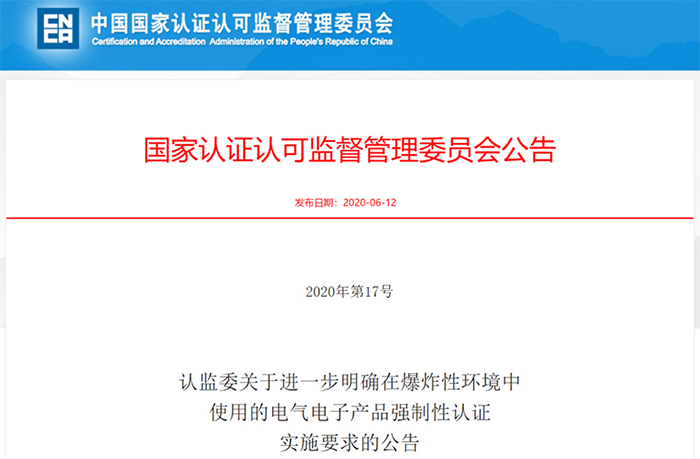 認監委關于進一步明確在爆炸性環境中使用的電氣電子產品強制性認證