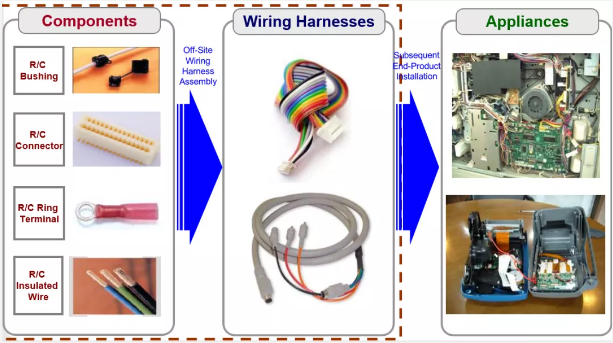 線束的組裝是線束生產商根據成品制造商所提供的組線圖面、工程圖或其它規格書進行的,成品制造商會詳細注明組裝線束時所需的構成組件(Construction Element)和零部件要求。