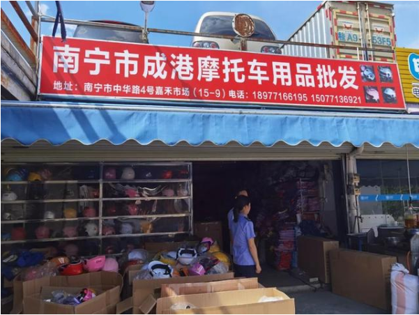 根據(jù)群眾舉報(bào)和事先摸排,9月17日上午10時(shí),廣西及南寧市市場(chǎng)監(jiān)管部門(mén)聯(lián)合執(zhí)法,對(duì)南寧市中華路嘉禾電動(dòng)車(chē)摩托車(chē)配件市場(chǎng)的多家頭盔銷(xiāo)售商家進(jìn)行突擊檢查。