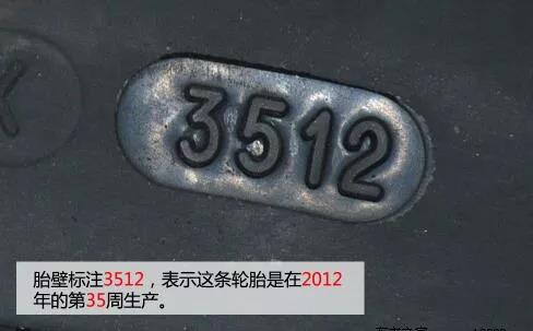 雖然汽車輪胎保質期沒有固定,但輪胎必須標注生產日期,我們在購買輪胎時,應該購買生產日期更近的輪胎,確保自己買到尚在最佳狀態的輪胎。比如查看輪胎的胎壁(如圖),標注3512,表示這條輪胎是在2012年的第35周生產,大概就是2012年8月生產的輪胎。