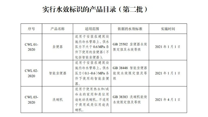 根據《水效標識管理辦法》規定,國家發展改革委、水利部、市場監管總局組織制修訂了《中華人民共和國實行水效標識的產品目錄(第二批)》及《智能坐便器水效標識實施規則》《洗碗機水效標識實施規則》,洗碗機水效標識實施規則》自2021年4月1日起實施,2021年4月1日前出廠或進口的產品,可延遲至2022年4月1日前加施水效標識。