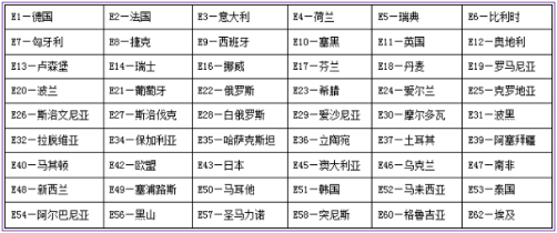 E-mark認證是歐洲經濟委員會(Economic Commission for Europe,簡稱ECE)針對車輛及零部件產品出口至其成員國市場實施的一種技術要求,認證標準為ECE Regulation。歐洲經濟委員會是聯合國下屬機構之一,并非歐洲組織,其它成員國分別有來自歐洲、亞洲、非洲、大洋洲約60個國家認可該認證。同時,任何一個成員國頒發的證書在其他成員國都相互認可。由于歐洲經濟委員會的簡寫是ECE,E-mark認證也稱為ECE認證。為了區分是哪個成員國簽發的證書,每個成員都有一個代號,如下圖: