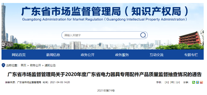 廣東省市場監督管理局關于2020年度廣東省電力器具專用配件產品質量監督抽查情況的通告