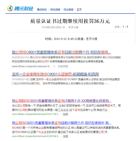 再者近期,小編在朋友圈及一些網絡上又看到有些同行在吐槽公司使用過期的ISO認證證書被處罰的事情,其實這個并不是個案,很多企業主對這個并不重視,覺得有一份證書就可以了,沒必要勞心勞力天天去留意。