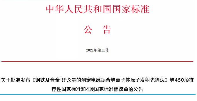 國家市場監督管理總局(國家標準化管理委員會)批準《鋼鐵及合金 硅含量的測定 電感耦合等離子體原子發射光譜法》等450項推薦性國家標準和4項國家標準修改單,現予以公布。