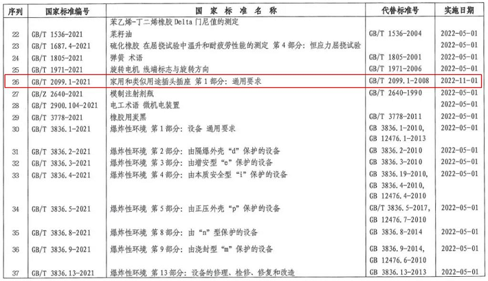 日前,《關(guān)于批準(zhǔn)發(fā)布〈數(shù)據(jù)中心能效限定值及能效等級(jí)〉等602項(xiàng)國(guó)家標(biāo)準(zhǔn)和1項(xiàng)國(guó)家標(biāo)準(zhǔn)修改單的公告》正式發(fā)布,其中包括GB/T 2099.1-2021《家用和類似用途插頭插座 第1部分:通用要求》和GB/T 1002-2021《家用和類似用途單相插頭插座 型式、基本參數(shù)和尺寸》,這兩項(xiàng)標(biāo)準(zhǔn)分別代替GB/T 2099.1-2008和GB/T 1002-2008,新版標(biāo)準(zhǔn)正式實(shí)施日期為2022年11月1日,詳情如下: