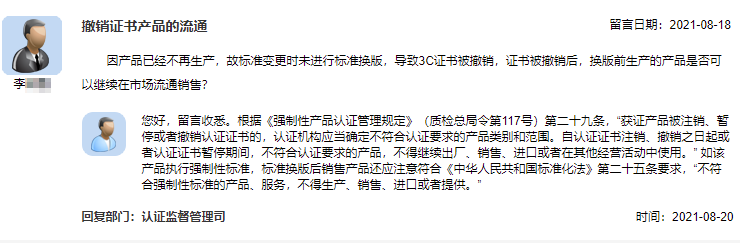 因產(chǎn)品已經(jīng)不再生產(chǎn),故標(biāo)準(zhǔn)變更時(shí)未進(jìn)行標(biāo)準(zhǔn)換版,導(dǎo)致3C證書(shū)被撤銷(xiāo),證書(shū)被撤銷(xiāo)后,換版前生產(chǎn)的產(chǎn)品是否可以繼續(xù)在市場(chǎng)流通銷(xiāo)售?