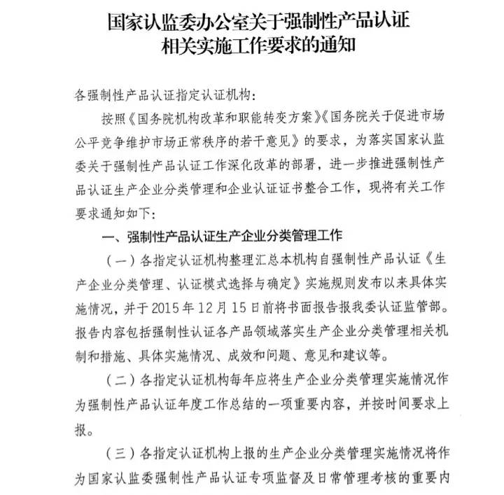 摘要: 據悉,國家認監委今日發布了關于強制性產品認證相關實施工作要求的通知,將對強制性產品認證生產企業進行分類管理,并對強制性產品認證證書開展整合工作。