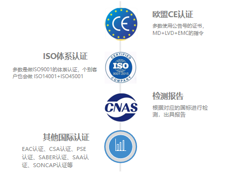 常見的CE認證,ISO體系認證,檢測報告以及其他國際認證,會根據客戶產品投放的市場來決定做其中一個或者多個認證項目,主力市場在國內跟出口的話,對于證書的需求點是不一樣的。下面我們分享一下為何需要做這些認證。