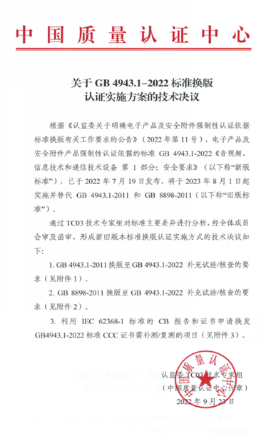 根據(jù)《認監(jiān)委關(guān)于明確電子產(chǎn)品及安全附件強制性認證依據(jù)標準換版有關(guān)工作要求的公告》(2022年第11號),電子產(chǎn)品及安全附件產(chǎn)品強制性認證依據(jù)的標準GB 4943.1-2022《音視頻、信息技術(shù)和通信技術(shù)設(shè)備第1部分:安全要求》已于2022年07月19日發(fā)布,將于2023年08月01日起實施并替代GB 4943.1-2011和GB 8898-2011。