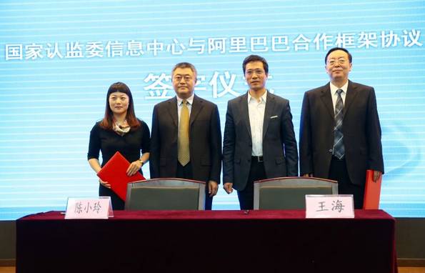 12月24日上午,國家認監委信息中心與阿里巴巴簽署合作框架協議。國家認監委副主任王大寧(左二)、國家認監委信息中心主任王海(右一)、阿里巴巴集團副總裁石東偉(右二)、阿里巴巴集團資深總監陳小玲(左一)出席。